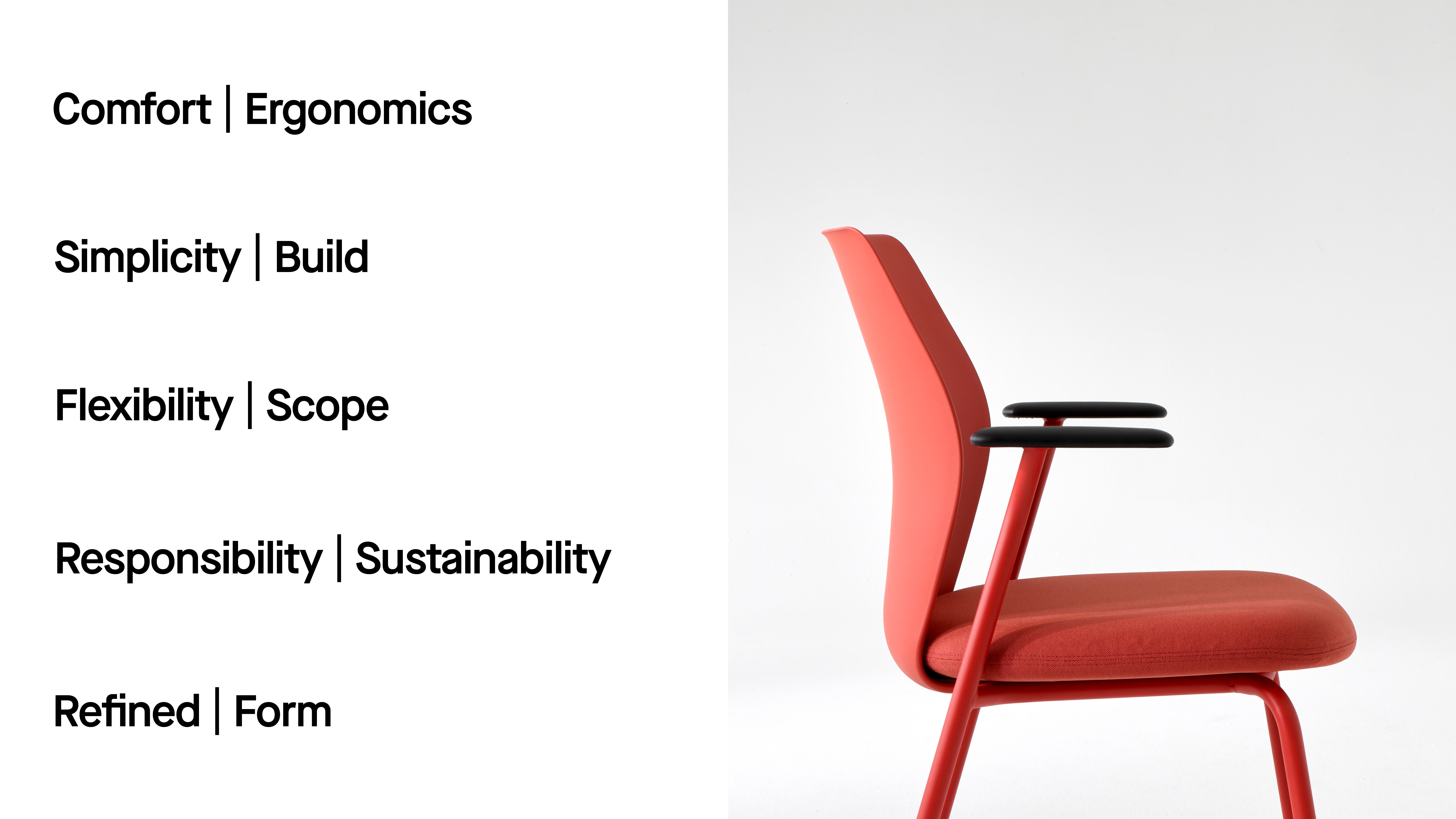 Contour is a lightweight, flexible work and meeting chair, featuring a highly efficient single-piece plastic backrest that provides generous ergonomic support to a wide demographic. Designed for any setting; healthcare, education, and corporate environment, Contour is a highly adaptable platform that can migrate seamlessly between desk work, casual meetings and touch-down sessions.